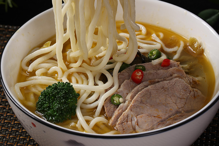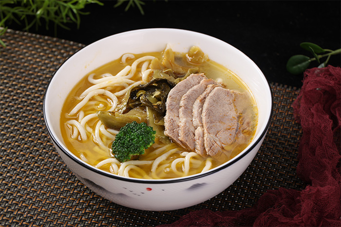 2.鮮面條180克,熟牛肉50克,酸菜20克,西蘭花1朵